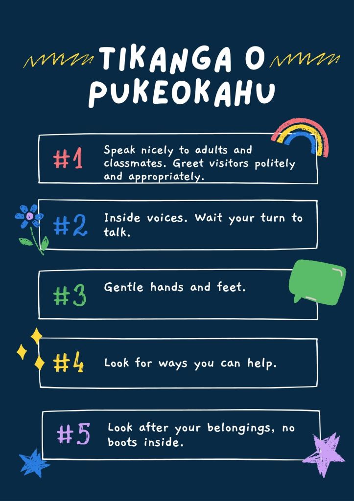 Finally…earlier this term we came up with Tikanga o Pukeokahu which is a list of the right way to be at our school. Below is the tikanga our tamariki agreed upon. We are working closely with the tamariki to ensure our tikanga are upheld within our kura.