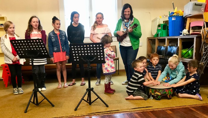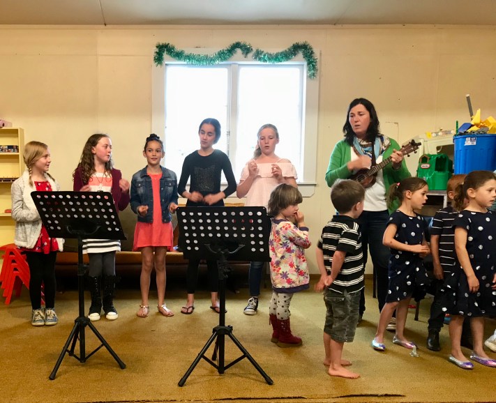 Last night we held the Pukeokahu Christmas party at the local hall. Chrissie came to help the children with their singing.