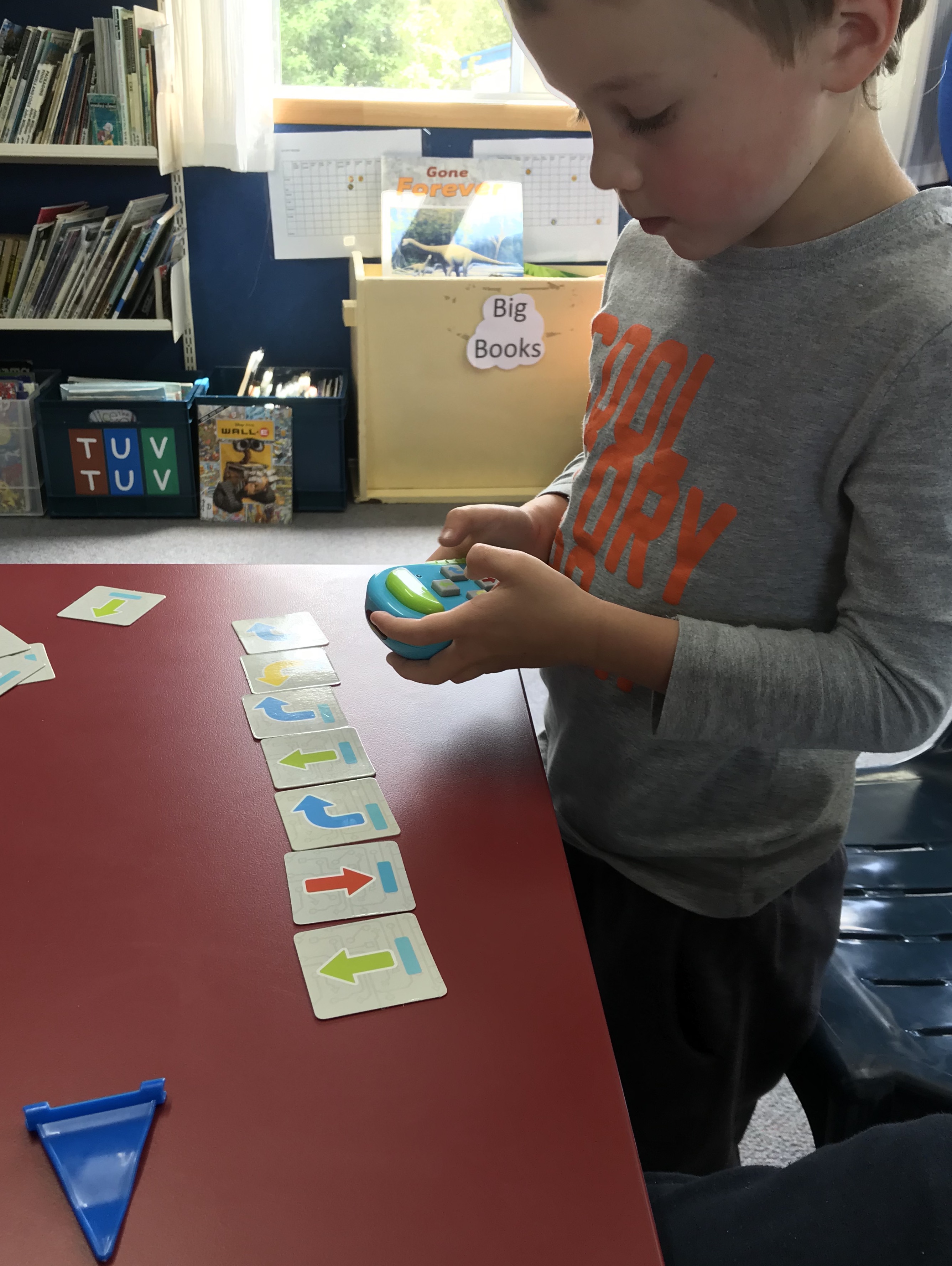 We used coding cards to help us with coding the instructions. He also makes noises when he is going and when you click the sound button. Keeva
