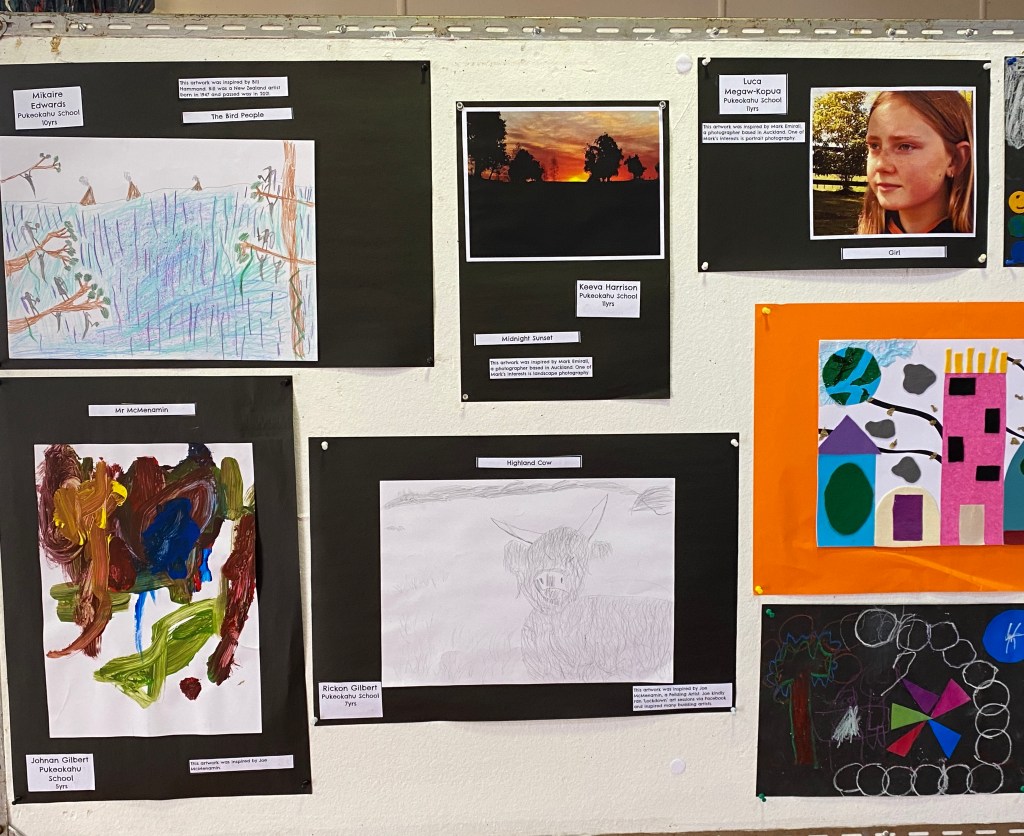 As well as tripping around the rohe having fun we also had our heads down doing some hard mahi. The Fakes and Forgeries Art Display is being held in Mangaweka this weekend so we spend the final weeks of last term learning about NZ Artists, writing biographies then ‘faking’ or forging’ their artwork. We learnt lots about people we’d never heard of and some help literacy skills in the process. If you’re in Mangaweka this weekend (or going through) call in to the Hall to see the school displays. Here’s a sneak peek of ours….