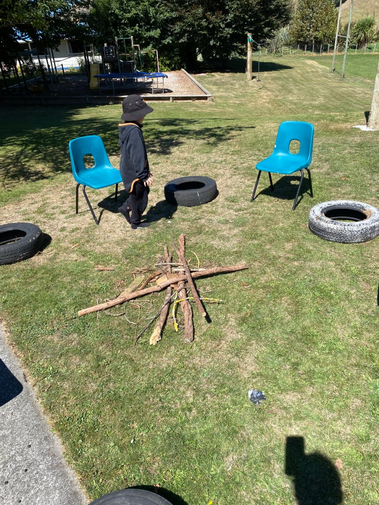 Outside Rickon was busy inventing his own version of Stone Henge…Wood Henge. What a fantastic demonstration of using his prior knowledge then creating something new from that. His sign making was awesome and showed his ability to use writing outside of the formal classroom setting. But don’t worry the girls didn’t just stick to the kitchen. They were amongst the outside action building a campfire, reliving real life experiences and using that knowledge. The woodwork table also got well used to make all sorts of ‘things’ they needed for their campfire / house creation.