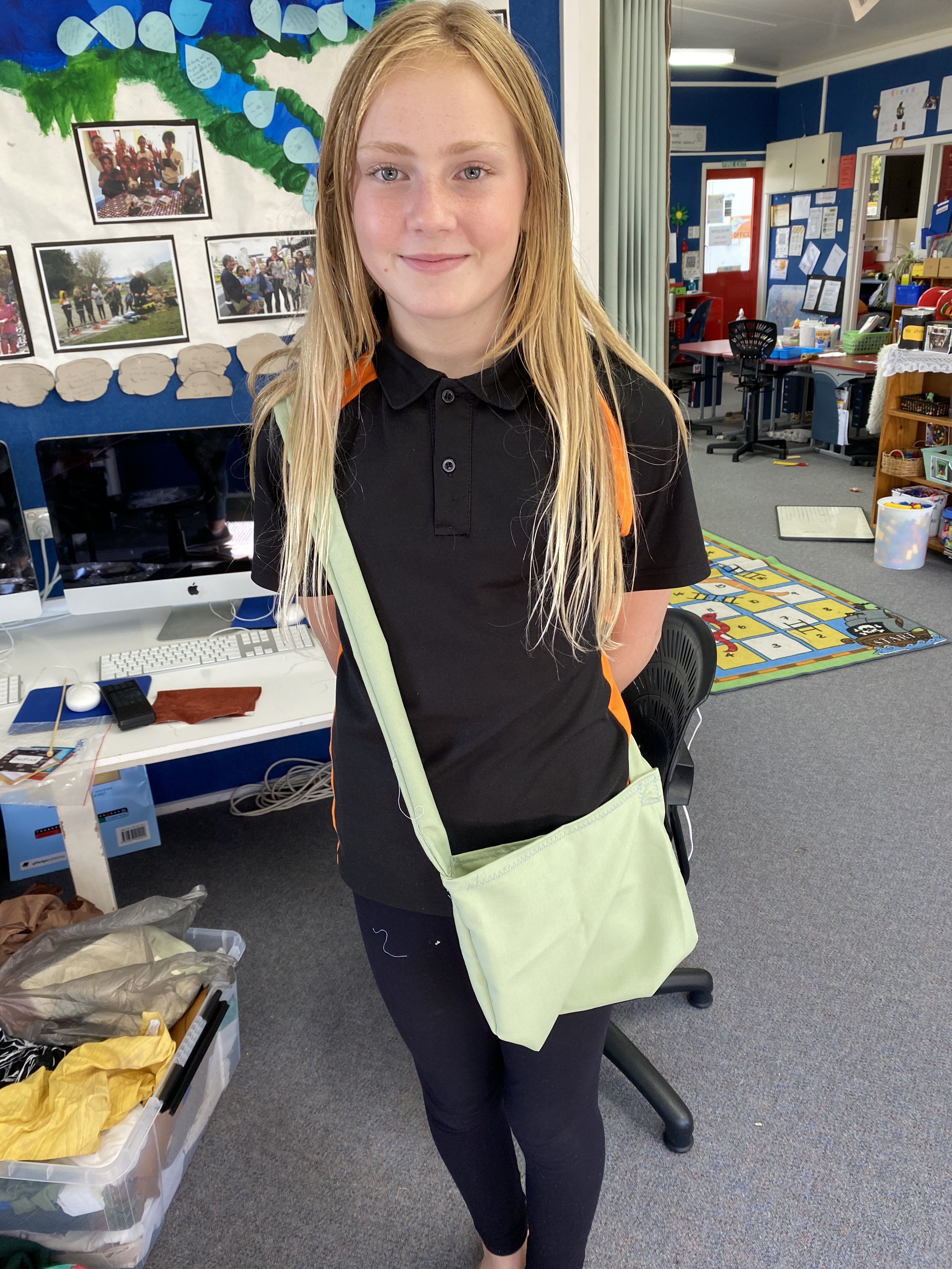 Today Keeva and Luca dedicated their Make Day time to the sewing machine and small craft. Keeva, found a half-made bag among the fabric. This became a very nifty side bag, when she stitched herself a strap for it. The challenging part was turning the strap back in the right way. It turned out pretty cool and she’s stoked with it. Luca continued adding to her ‘family’ of wooden dolls by creating an alien addition. So creative in her thinking. Again the Technology Curriculum is front and centre.